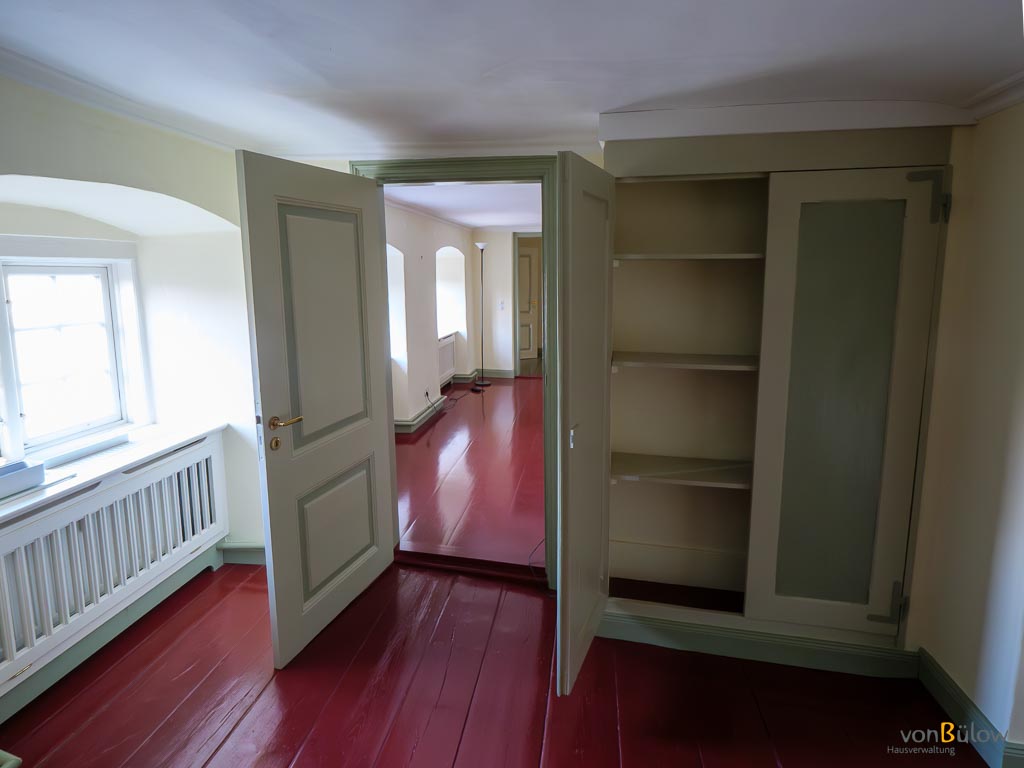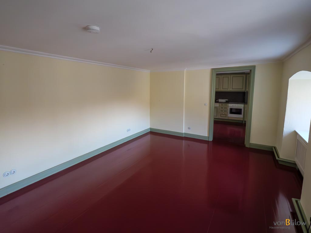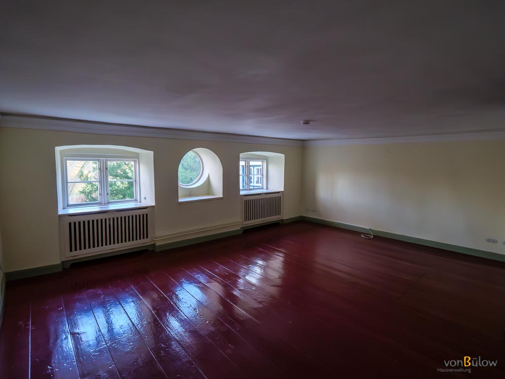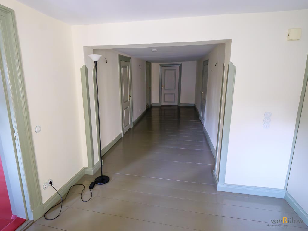 Die Räumlichkeiten verfügen über eine funktionale und zugleich repräsentative Aufteilung. Drei der Räume sowie die Küche bieten einen fantastischen Blick auf den Hasensee, ein weiterer Raum blickt nach Süden auf den imposanten Ehrenhof. Die vorhandene Einbauküche ist ausgestattet mit Cerankochfeld, Backofen, Mikrowelle, Kühlschrank mit Gefrierfach und Geschirrspüler. Weiter ist ein großzügiges Duschbad sowie ein kleiner Abstellraum vorhanden.
