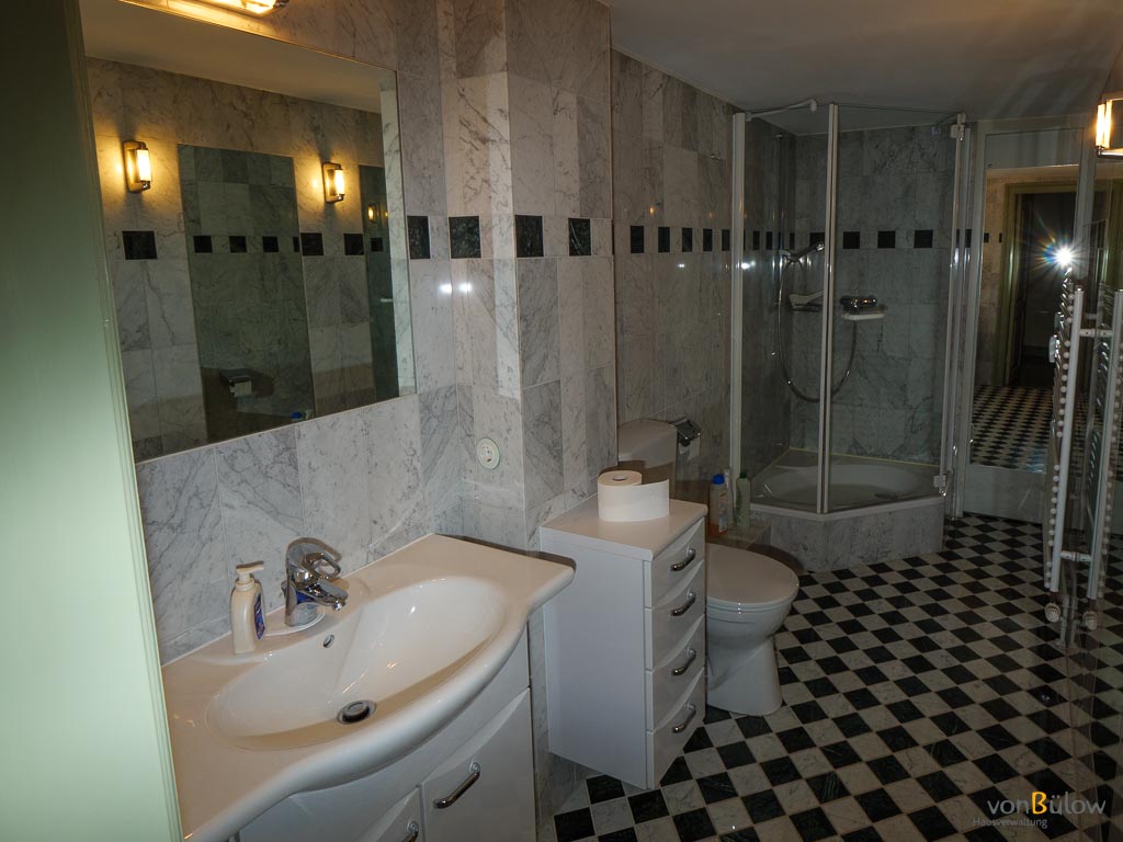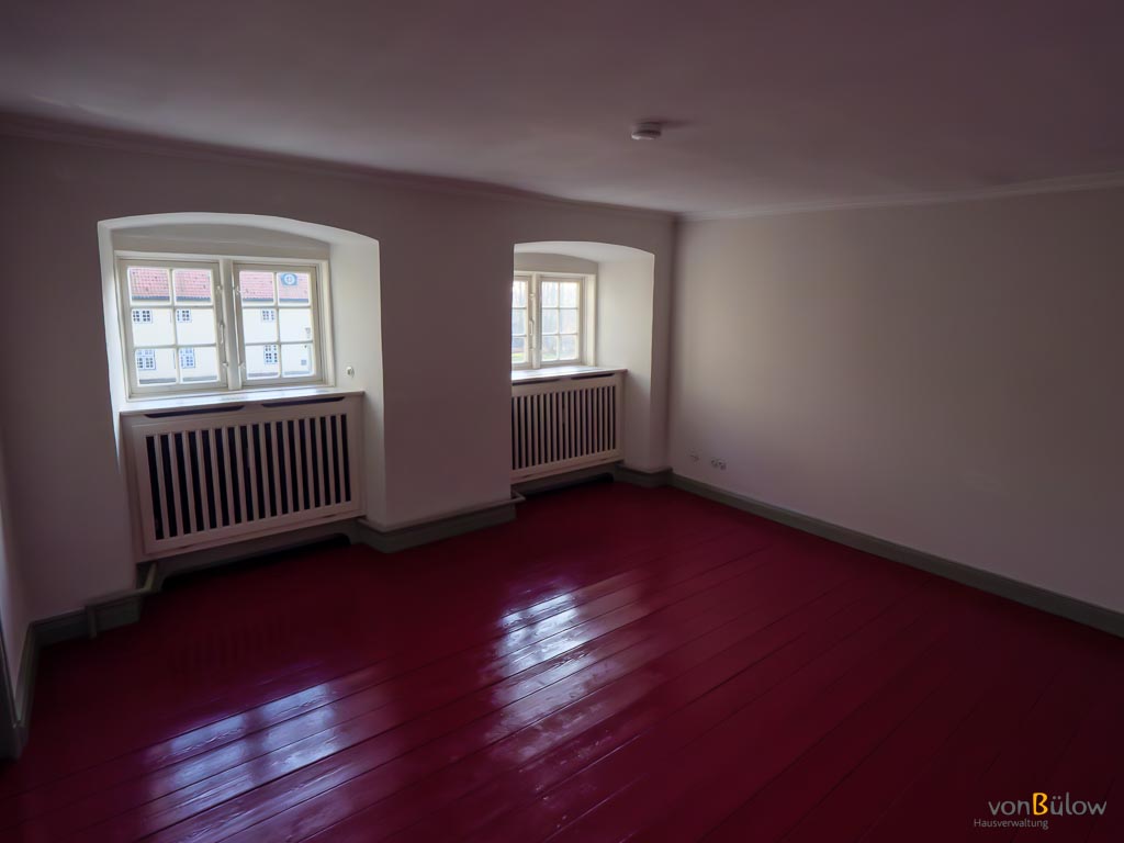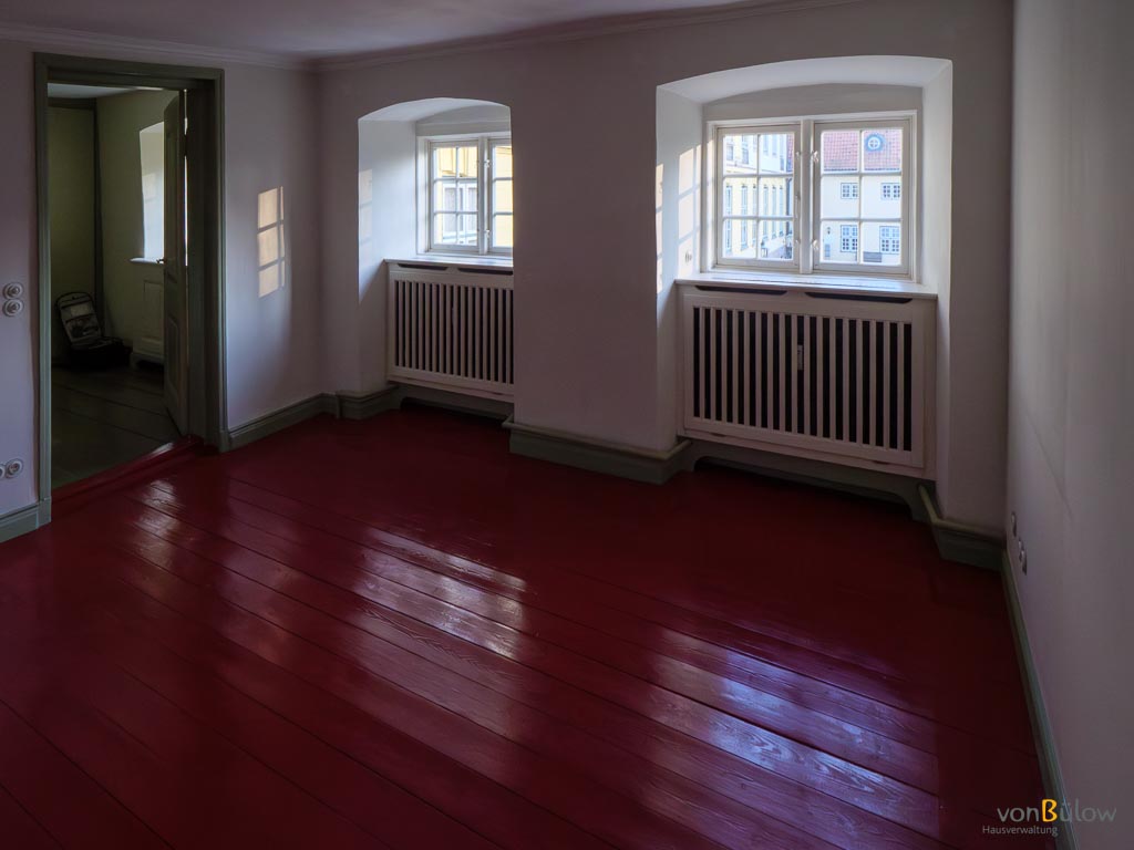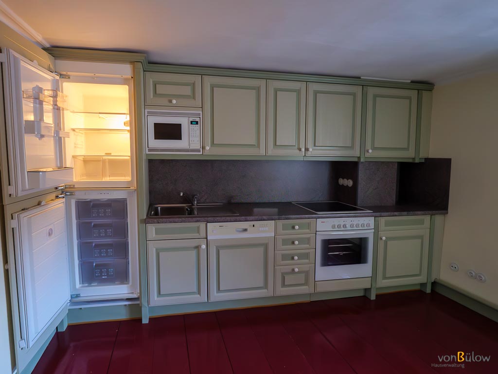 Die Räumlichkeiten verfügen über eine funktionale und zugleich repräsentative Aufteilung. Drei der Räume sowie die Küche bieten einen fantastischen Blick auf den Hasensee, ein weiterer Raum blickt nach Süden auf den imposanten Ehrenhof. Die vorhandene Einbauküche ist ausgestattet mit Cerankochfeld, Backofen, Mikrowelle, Kühlschrank mit Gefrierfach und Geschirrspüler. Weiter ist ein großzügiges Duschbad sowie ein kleiner Abstellraum vorhanden.